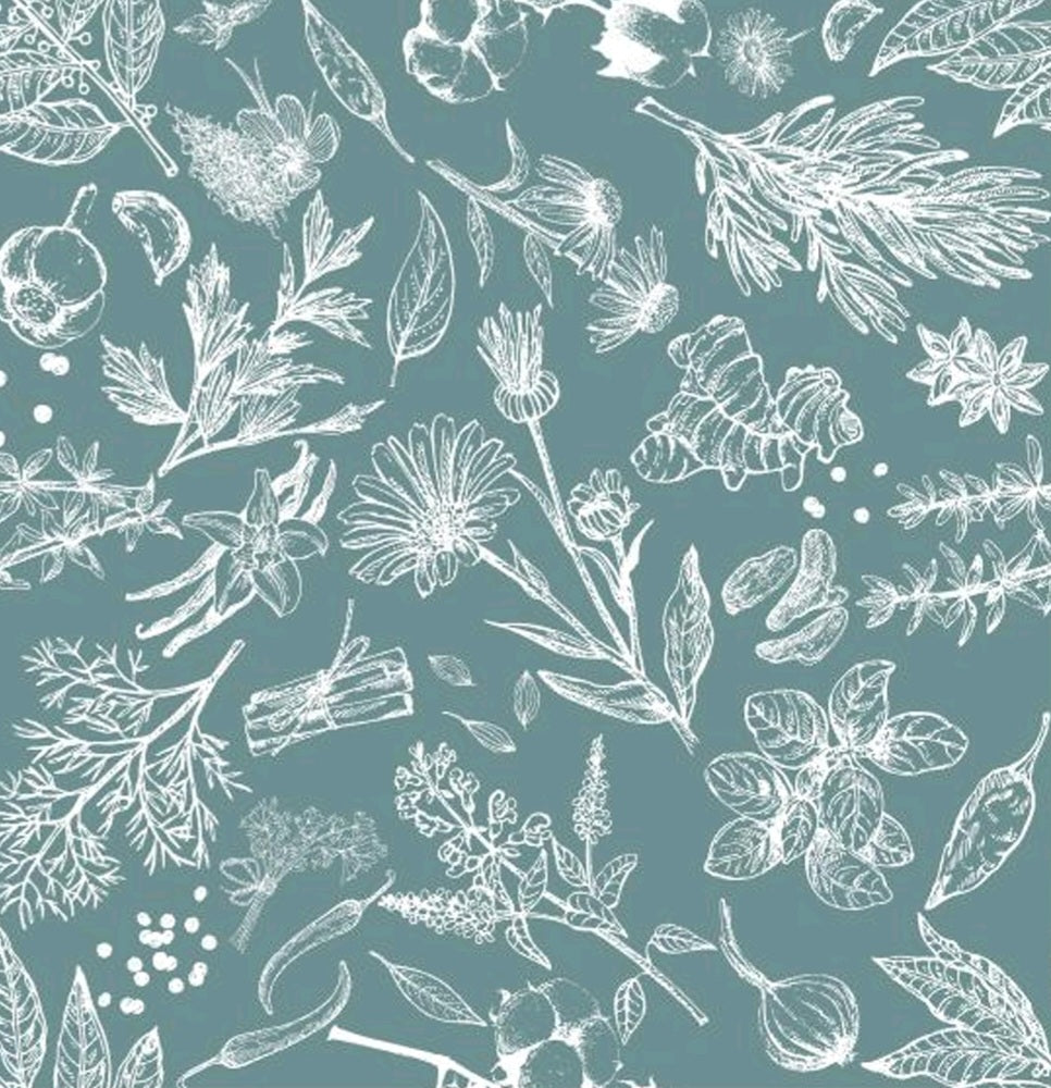 A quiet homage to the healing hands of our grandmothers. This soft misty blue print carries the hand-drawn whispers of rosemary, calendula, ginger, anise, and wild fig - sacred botanicals once gathered under sun and moon to mend, soothe, and nourish.