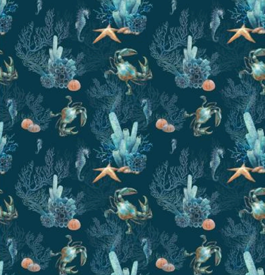 Crabs, coral, seahorses, and sea stars drift across a tapestry of indigo saltwater - a print echoing ancient ocean rhythms and primal memory. An heirloom of the sea.