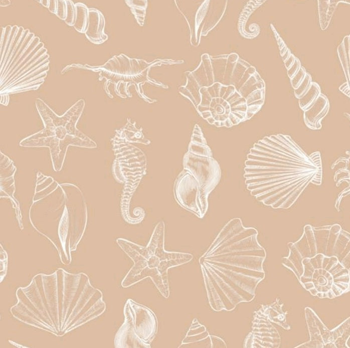 Evoking the quiet poetry of low tide, Shoreline Relic gathers the treasures of the deep. Shells, seahorses, and starfish, etched in soft bone-white against warm sand. It carries the hush of ancient tides and the salt-kissed rhythm of the earth’s oldest waters, wrapping your little one in the timeless embrace of the ocean’s cradle.